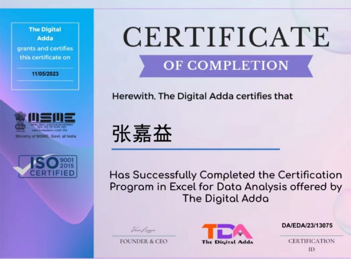 大学四年,张嘉益的每一步都走得坚定而踏实。她连续四年荣获校级一等奖助学金,专业成绩始终保持第一;荣获黑龙江省三好学生、黑龙江省优秀毕业生荣誉称号;考取英语专四、专八、高级国际商务秘书等多项证书;参与“外研社·国才杯”等国家级竞赛并屡获佳绩。她的论文《新时代高校教育管理模式的创新研究》更是发表于核心期刊《教学与研究》。