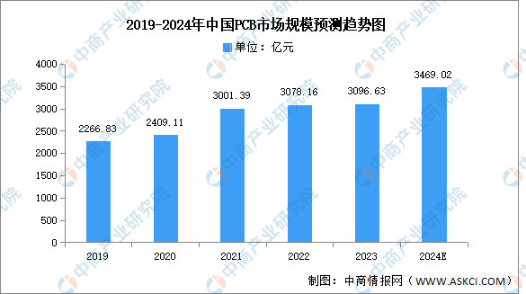 作为电子信息产业的基础,PCB印制电路板行业市场规模巨大。根据中商产业研究院发布的《2024-2029年中国印制电路板(PCB)行业发展趋势及预测报告》显示,2022年中国PCB市场规模达3078.16亿元,2023年市场规模已增至3096.63亿元,预计2024年中国PCB市场规模将进一步增长至3469.02亿元。