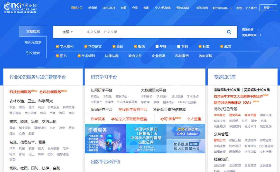 中国知网知识发现网络平台(CNKI)面向海内外读者提供中国学术文献、外文文献、学位论文、报纸、会议、年鉴、工具书等各类资源统一检索、统一导航、在线阅读和下载服务。